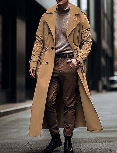 Муж. Пальто Тренч Длинный тренч Отпуск Повседневные Осень Зима Полиэстер С защитой от ветра Сохраняет тепло Верхняя одежда Одежда Мода Классика Полотняное плетение Карман Лацкан Двубортный крой