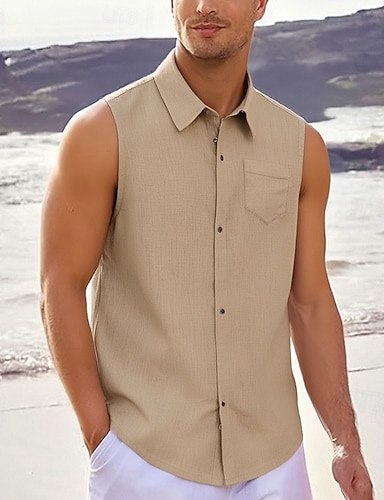 Муж. льняная рубашка Безрукавка Жилет Майки Без рукавов V-образный вырез Лето Полотняное плетение Мода Богемные Классика Для улицы Повседневные Спорт Белый Футболка для мужчин