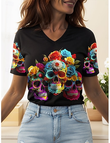 Хэллоуин Женская Футболка Черепа Цветочный Принт Винтаж Стильный Классический Короткий Рукав V Вырез Обычные Топы Ежедневный Принт Черный Оранжевый Серый Лето Весна