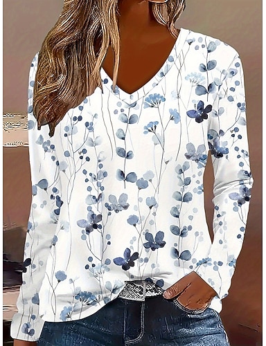 Женская футболка с длинным рукавом V-образный вырез длинная туника цветочная графика растения винтажный стиль классические топы ежедневный выход выходные принт светло-зеленый голубой небесно-голубой