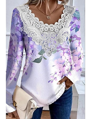 Блуза туника для женщин с кружевной вставкой V-образным вырезом длинными рукавами цветочный графический принт элегантная винтажная круглошейная регулярные топы повседневные для выхода на выходные