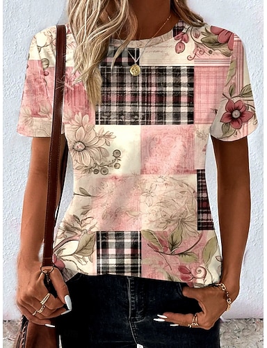 Жен. Футболка Цветочный принт Графика Геометрический принт На каждый день С короткими рукавами Вырез под горло Круглый вырез Обычные топы Повседневные С принтом Розовый Лето
