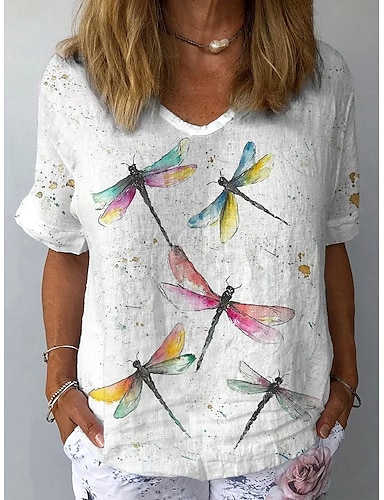 Жен. Футболка Графика Стрекоза Винтаж Стиль Классика С короткими рукавами V-образный вырез Обычные топы Повседневные выходные Одежда для отпуска С принтом Белый Лето Весна Осень