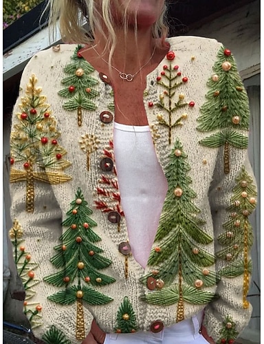 Жен. Кардиган Повседневные Графика Новогодняя ёлка Рельефный узор Вырез под горло Пуговицы С принтом Длинный рукав Обычные топы Вязать на открытом воздухе Праздники выходные Зеленый Бежевый Осень Зима