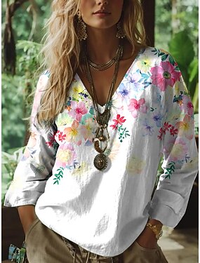 Блуза туника для женщин V-образным вырезом с длинным рукавом бохо Casual топы с цветочным графическим винтажные обычные повседневная носка принт белый красный королевский синий фиолетовый зеленый