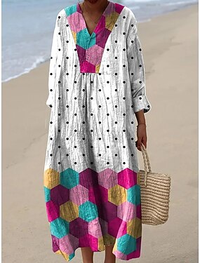 Женское миди-платье с V-образным вырезом и длинными рукавами легкий свободный крой A-силуэт повседневное платье богемный стиль для вечеринок для походов графический геометрический длинные рукава