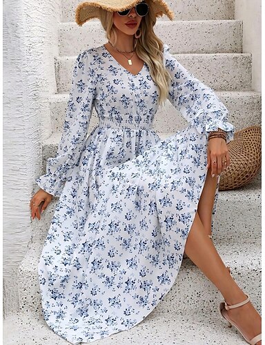 Жен. Длинное платье Повседневное платье Платье в стиле 50-х годов Платье A-силуэта Платье в стиле бохо На каждый день Повседневные Стандартный Цветочный принт Длинный рукав V-образный вырез