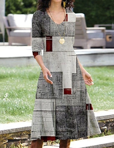 Жен. Платье средней длины Повседневное платье Современное Отпуск Повседневные Праздники Стандартный Геометрический принт Абстракция Рукав 3/4 V-образный вырез Светло-серый Весна Осень