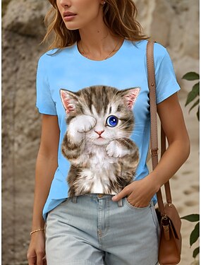 Жен. Футболка Графика Животное Кот Винтаж Симпатичные Стиль Стиль С короткими рукавами Вырез под горло Круглый вырез Обычные топы Повседневные выходные С принтом Белый Желтый Розовый Красный Синий
