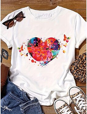 Жен. Футболка С сердцем Цветочный принт Графика Винтаж Стиль Классика С короткими рукавами Вырез под горло Круглый вырез Обычные топы Повседневные С принтом Черный Белый Розовый Светло-синий