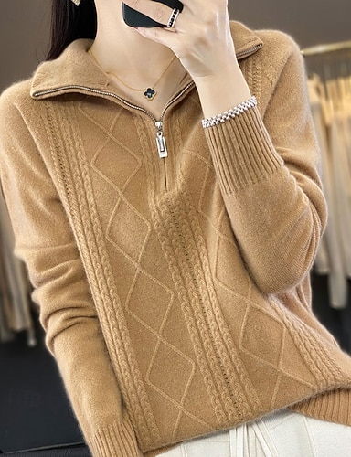 Жен. Вязаная ткань Пуловер Мода На каждый день Чистый цвет Рельефный узор Половина молния Молния Трикотаж Длинный рукав Обычные топы Вязать на открытом воздухе Повседневные выходные Верблюжий