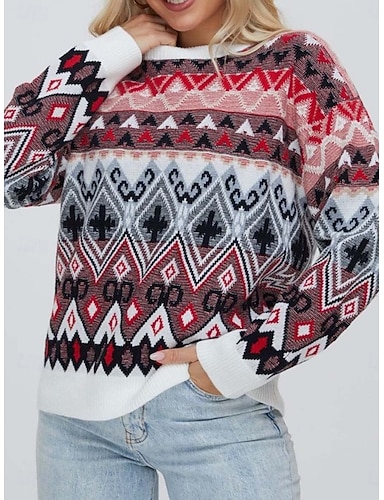 Жен. Вязаная ткань Мода Уличный стиль Повседневные Геометрический принт Вырез под горло Трикотаж Текстура Длинный рукав Обычные топы Вязать Офис Черный Красный Осень Зима