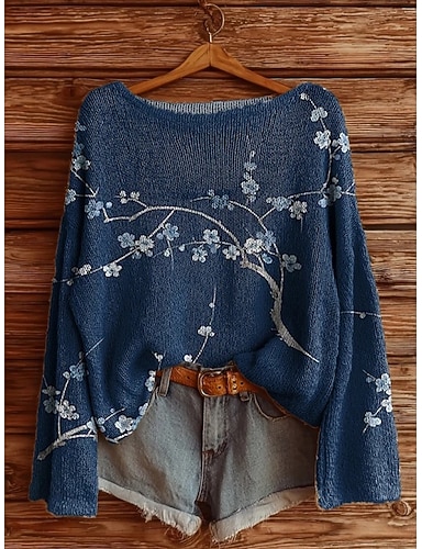 Жен. Пуловер На каждый день Цветочный принт коренастый Вырез под горло Трикотаж Длинный рукав Обычные топы Вязать Повседневные Праздники На выход Синий Лиловый Осень Зима