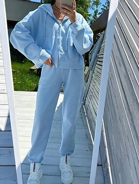 Жен. Активный Мода Блуза Толстовка Комплекты брюк Длинный рукав Капюшон Сплошной цвет Молния Отпуск Праздники Розовый Хаки Светло-серый Осень Стандартный