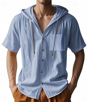 Муж. Рубашка Повседневная рубашка Кнопка рубашка Хлопчатобумажную рубашку Полотняное плетение Отпуск Для улицы Черный Белый Светло-зеленый Темно-синий С короткими рукавами Капюшон Лето Одежда