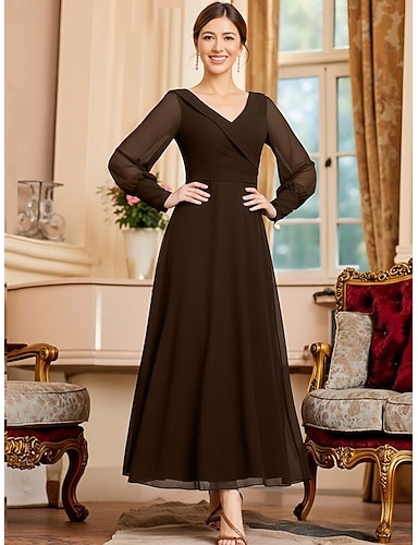 А-силуэт В пол До щиколотки Платье для вечеринки Коктейльные платья Свадебное платье для гостей Платье для матери невесты Длинный рукав V-образный вырез Элегантный стиль минималист