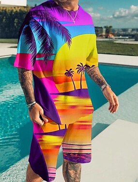 Муж. Графика Кокосовая пальма 2шт Наборы футболок Подходящие наборы С короткими рукавами Короткие штаны Вырез под горло Оригинальный рисунок На каждый день Удобный