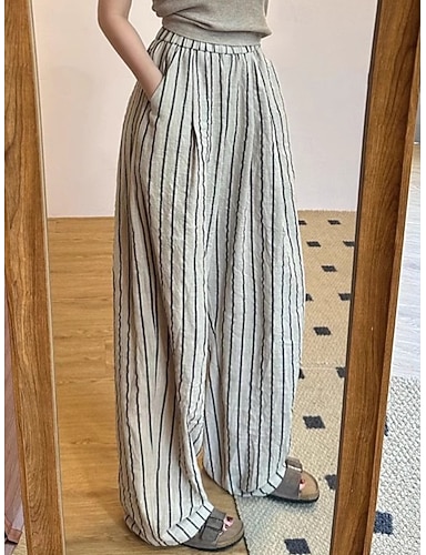 Жен. Брюки из хлопка и льна Нахальный Брюки Уличный стиль На каждый день Полная длина Средняя талия Полоски Карман Эластичная талия удобный Удобный Для улицы На выход Абрикосовый Черный Розовый Синий