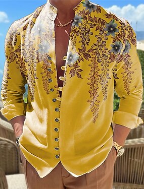 Муж. Цветочный принт Рубашка Кнопка рубашка Длинный рукав На каждый день На каждый день На выход выходные Весна лето Воротник-стойка С принтом Кнопка вниз Желтый Синий