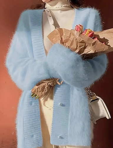 Жен. Вязаная ткань Кардиган Элегантный стиль Мода Уличный стиль Чистый цвет V-образный вырез Карман Трикотаж Длинный рукав Обычные топы Вязать на открытом воздухе Повседневные выходные Светло-синий
