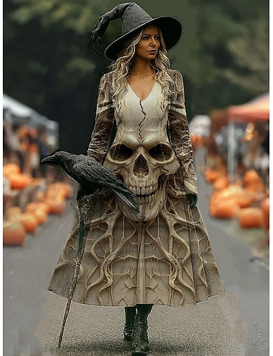 Хэллоуин Женское Платье С Миди Длиной Графика Черепов А-образного Силуэта Отпуск Повседневное Ежедневное Стандартная Посадка Графика Череп Длинный Рукав V-образный Вырез Синяя Оранжевая Серая Осень