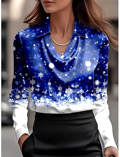 Новогодняя тематика Жен. Рубашка Омбре Графика В снежинку Элегантный стиль Стиль На каждый день Длинный рукав Вырез-хомут Обычные топы Офис Вечерние наряды Повседневные Рюши Драпировка