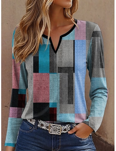 Жен. Футболка Графика Геометрический принт Винтаж Стиль На каждый день Длинный рукав Зубчатая шея Обычные топы Повседневные выходные С принтом Желтый Синий Лиловый Зеленый Весна Осень Зима