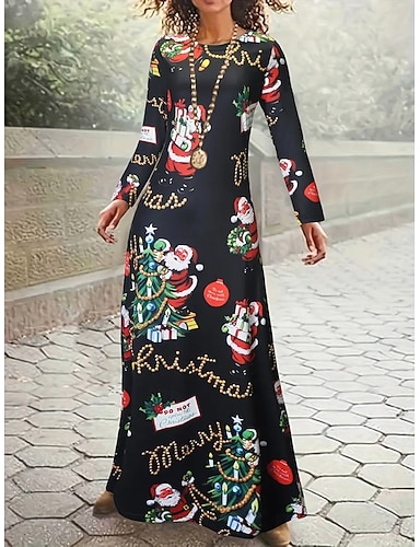 Жен. Длинное платье Платье-футболка Платье A-силуэта Летнее платье Отпуск На каждый день Пляжный стиль Повседневные Стандартный Графика Дед Мороз Новогодняя ёлка Длинный рукав Вырез под горло