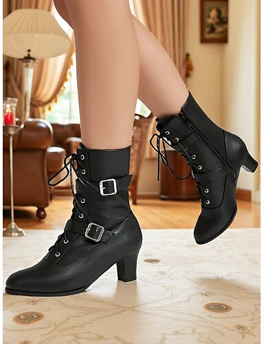 Женские черные ботильоны из искусственной кожи на шнуровке, с двойными пряжками на ремешках и средним каблуком, винтажные готические ботинки 50-х годов для косплея и вечеринок &повседневная модная