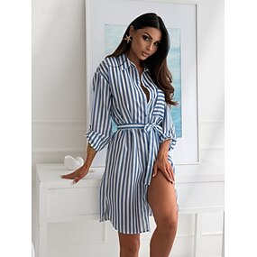 Жен. Мини-платье Платье-рубашка Платье с принтом Элегантный стиль Повседневные На выход Стандартный Леопард Полоски Длинный рукав Рубашечный воротник Леопардовый Розовый Синий Осень