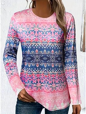 Женская футболка с длинными рукавами круглым вырезом туника графический геометрический рисунок роза винтаж стильная классическая обычная повседневная печать синий фиолетовый коричневый серый весна