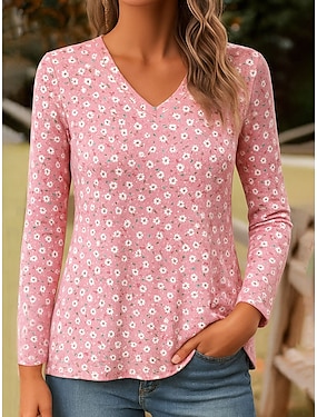 Женская футболка с V-образным вырезом длинным рукавом туника цветочный график растения винтажный стильный классический регулярный топ повседневный принт розовый синий фиолетовый зеленый весна осень