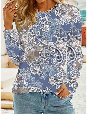 Жен. Футболка Цветочный принт Графика Градиент Элегантный стиль Винтаж Стиль Длинный рукав Вырез под горло Обычные топы Повседневные На выход выходные С принтом