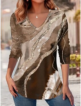 Женская футболка с V-образным вырезом длинным рукавом туника перо мода обычные топы повседневная печать белый вино коричневый весна и осень