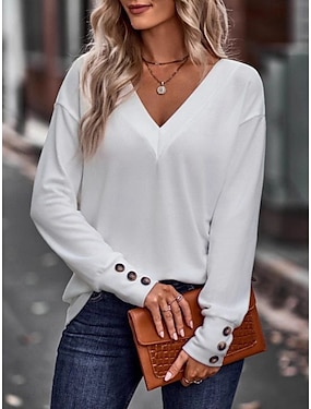 Жен. Блуза Сплошной цвет Стиль На каждый день Длинный рукав V-образный вырез Обычные топы Повседневные Пуговицы Черный Белый Винный Военно-зеленный Темно синий Весна Осень