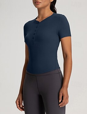Жен. Футболка для йоги Хенли Воротник Стреч Дышащий С короткими рукавами Виды спорта Сплошной цвет Верхняя часть Для Пилатес Бег Йога Спортивная одежда
