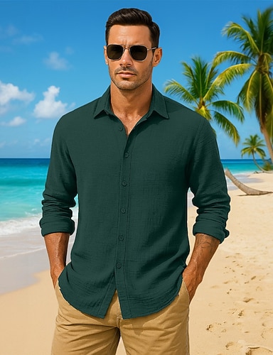 Муж. Рубашка Летняя рубашка Повседневная рубашка Пляжная рубашка Кнопка рубашка Светлый хаки Черный Белый Светло-зеленый Темно-синий Длинный рукав Сплошной цвет Воротничок Отпуск Повседневные Одежда