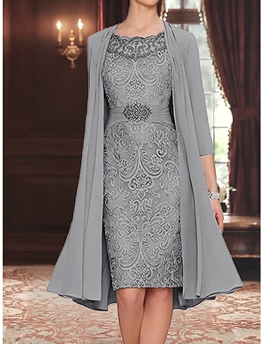 Платье-обтягивающее для матери невесты Свадебная гостья Элегантное Винтажное Вырез с камнями Длина чая Кружево Рукав 3/4 с пайетками
