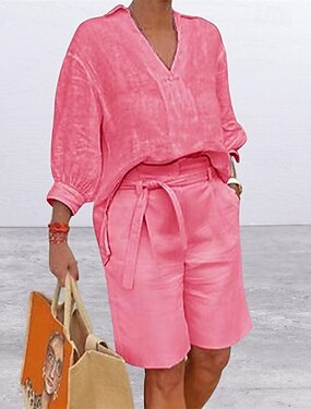 Жен. Мода Уличный стиль Рубашка Комплекты хлопкового льна Комплекты из двух предметов Пляжные шорты Рукав до локтя V-образный вырез Сплошной цвет Кулиска На каждый день Свидание