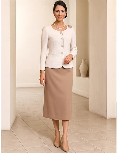 Из двух частей А-силуэт Платье Костюм Платье для матери невесты Элегантный стиль Винтаж Вырез под горло Ниже колена Полиэстер Длинный рукав с Пуговицы