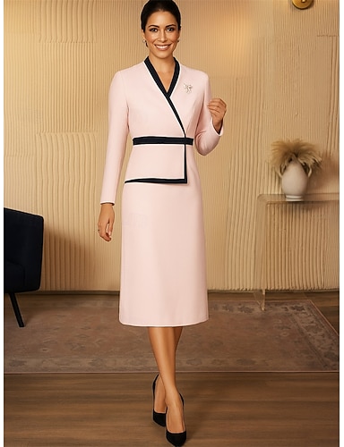 Футляр Платье для матери невесты Элегантный стиль Винтаж V-образный вырез Ниже колена Сатин Длинный рукав с Цветовые блоки