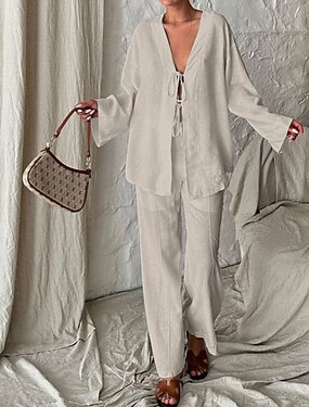 Жен. Мода Уличный стиль Рубашка Комплекты брюк Льняные брюки Брюки Длинный рукав Рубашечный воротник Сплошной цвет Кулиска На каждый день Свидание Розовый Хаки Серый Весна Стандартный