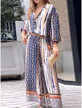 Жен. Мода Уличный стиль Блуза Широкие брюки Длинный рукав Рубашечный воротник Геометрический принт Официальные Для вечеринок Офис Белый Осень Свободное облегание