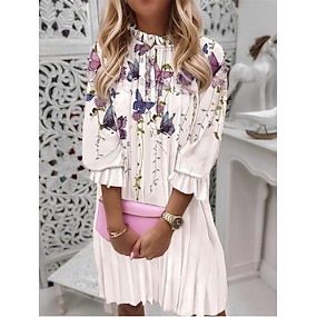 Жен. Платье средней длины Цветочное платье Платье с принтом Классика Современное на открытом воздухе Отпуск Праздники Стандартный Цветы Рукав 3/4 Вырез под горло Розовый Темно синий Синий Пурпурный