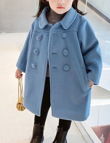 Дети Девочки Шерстяное пальто Длинный рукав Синий Бежевый Сплошной цвет Осень Зима Активный Школа 3-7 лет