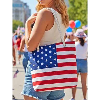 Женская холщовая сумка-тоут с американским флагом, вместительная сумка через плечо на молнии с веревочными ручками, патриотический стиль, идеально подходит для празднования Дня независимости, пляжного отдыха и повседневного использования.