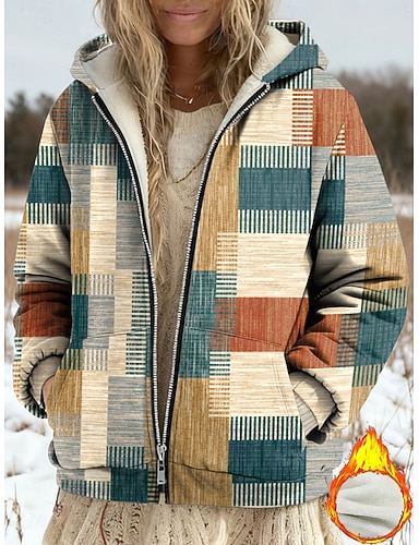 Жен. Зимнее пальто Флисовая жилетка Повседневная куртка Сохраняет тепло Молния Карман С принтом Мода На каждый день Геометрический принт Для улицы Повседневные Обычная Капюшон Стандартный