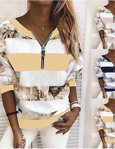 Жен. Футболка Цветочный принт Мода Современное Рукав 3/4 V-образный вырез Обычные топы Повседневные Оборки С принтом Хаки Лето