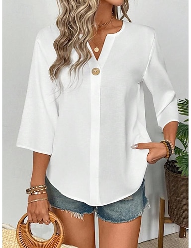 Жен. Блуза Сплошной цвет Стиль На каждый день Рукав 3/4 V-образный вырез Обычные топы Повседневные Праздники Пуговицы Черный Белый Оранжевый Лето Весна