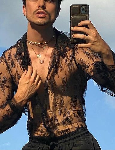 Муж. Рубашка Летняя рубашка Сетчатая рубашка Прозрачная рубашка Прозрачная блузка Черный Длинный рукав Полотняное плетение Лацкан Гавайский Праздники Сетка Одежда Мода На каждый день Удобный